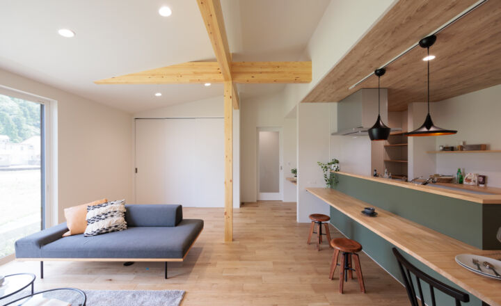 オークの床材や木目柄の天井に、グリーンのアクセントでナチュラルヴィンテージ風の平屋。 LDKは勾配天井にすることで平屋でも開放感のある空間になりました。 個室からLDKを通らず水回りに行ける、家族がほどよい距離感で過ごせる間取りです。