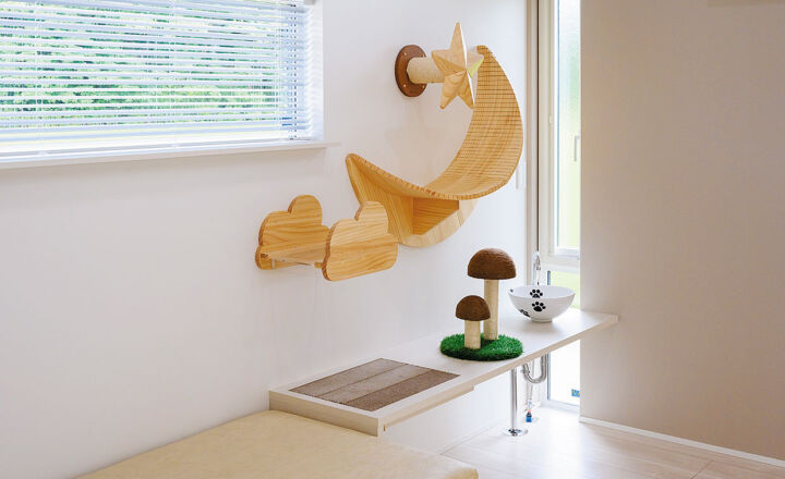 各部屋には高い場所が好きな猫のためにたくさんのキャットステップを設け、遊びの場所を作ることで運動不足や肥満を防ぎ、ストレスのない環境に。猫は窓から外を見るのも好きなので、FIX窓にもステップを取り付けて猫が退屈しない工夫をプラス。階段下の猫ハウスをはじめ、各部屋にはドアが閉まっていても自由に移動できる猫通路があり、体感温度に合わせて複数の居場所を選べるように配慮した